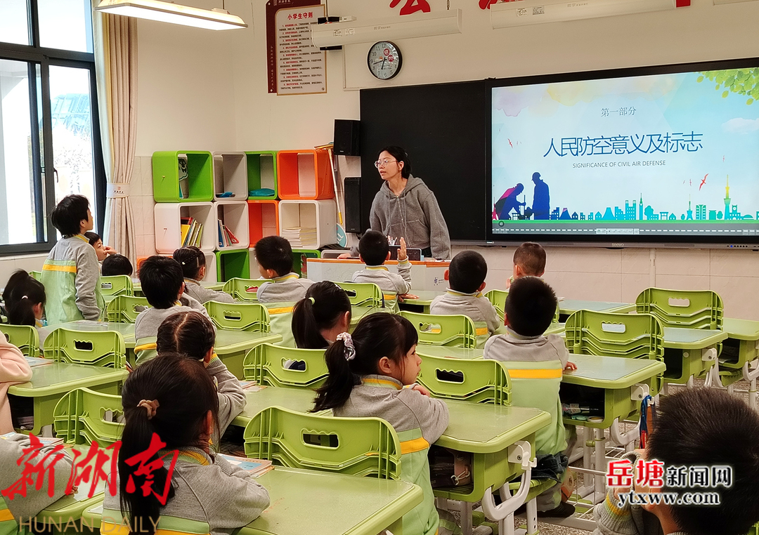 紧急疏散演练前,湖湘学校各班分别学习了人民防空的意义及标志等知识
