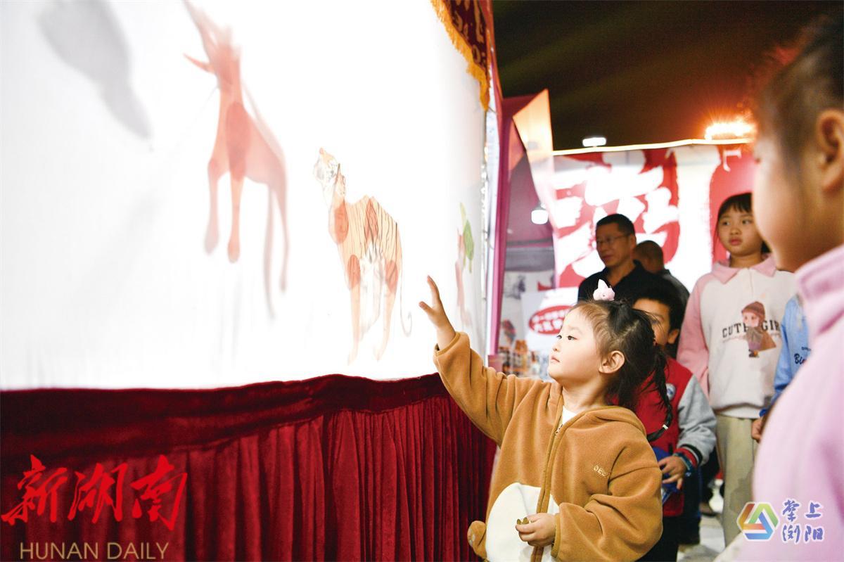 夜色越浓,好过影文创公司的展位就越热闹。这里挤满了小朋友,他们一边排队等着过一把“皮影戏”瘾,一边试吃着浏阳盐旱茶。