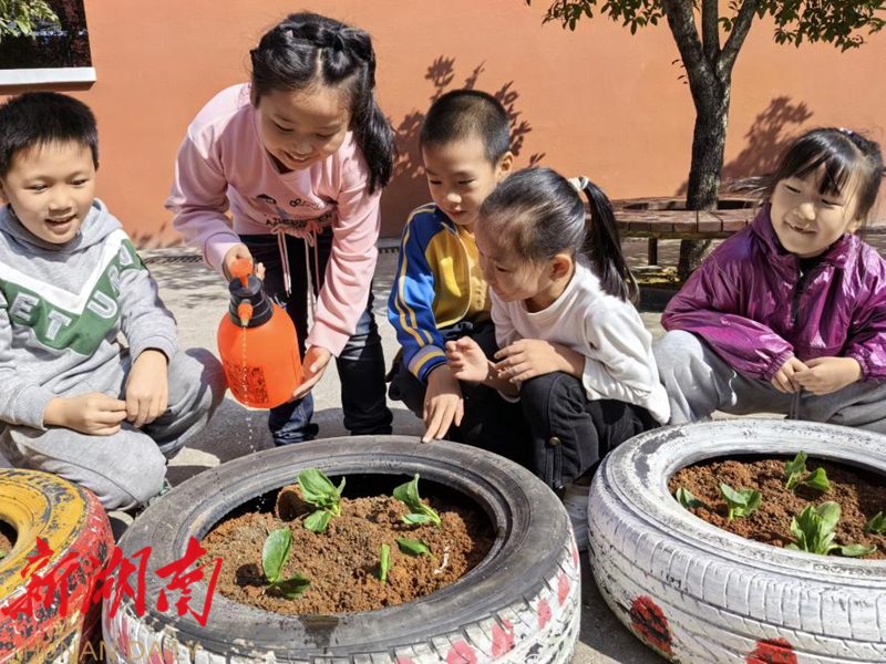 “今天,我发现蒜苗探出了头,让我感受到了生命的力量。”孩子们课间时常去浇水照料菜苗,在日常生活中养护它们,并记录下观察日记。每当幼苗破土而出,校园便回荡着他们的欢声笑语。嫩绿的幼苗与五彩斑斓的轮胎交相辉映,构成了学校里一道独特的风景。