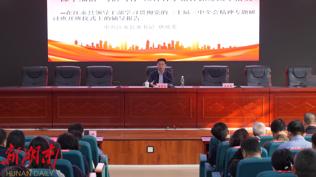 新江永客户端讯(记者 毛文涛 通讯员 陈健林) 11月5日,江永县领导干部学习贯彻党的二十届三中全会精神专题研讨班在县委党校开班。县委书记唐德荣出席开班式并作专题辅导。他强调,学习好、宣传好、贯彻好党的二十届三中全会精神,是当前和今后一个时期的重大政治任务。全县领导干部都应树牢改革意识,当好进一步全面深化改革的促进派、实干家,带头谋改革、抓改革、推改革、促改革,汇聚全县改革之力,推动高质量发展。