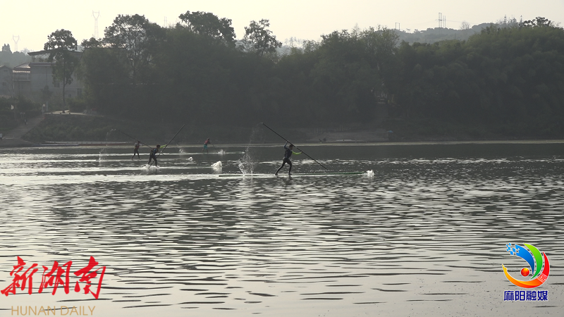 而在锦江河五三河段,参加独竹漂项目的运动员也在抓紧训练备赛。只见一人一竹,双脚踩在一根竹竿上,依靠手竿在身体两侧划水前进。队员们或破开水面一往无前,或稳踩漂竿独立于水中,颇有武侠小说中的大侠风范。