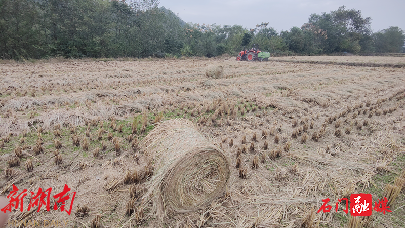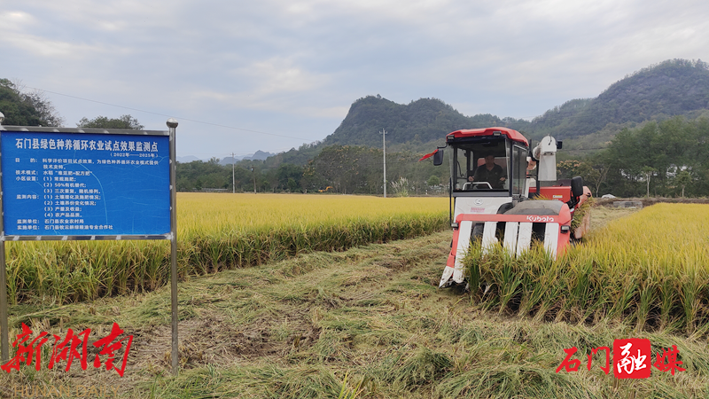 走进石门县农业农村局和牧云耕绿粮油专业合作社联合创办的“石门县绿色种养循环农业试点效果监测示范基地”,双季晚稻稻田一片金黄,沉甸甸的稻穗压弯了稻秆,微风拂过,淡淡的稻香弥漫开来,丰收的喜悦把你包围。伴着隆隆机声响过,收割机迅速地将稻谷收入“囊中”,田地里露出了一片“绿毯”,轮作的绿肥已“接班”努力生长;而秸秆自动回收机也没闲着,迅速将收割机“吐”出来的稻秆“吃”进去,不一会儿,一大卷自动捆绑结实的“秸秆卷”已下线,等待运往专业制肥场,和从各地收集的畜禽粪污一起堆沤制成优质有机肥“哺乳”农田,“成片种、规模养、以养带种、种反哺养”,如此种养“闭链”,循环往复、绿色发展。