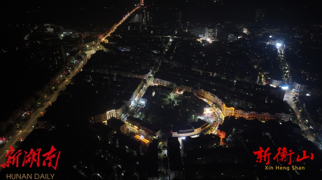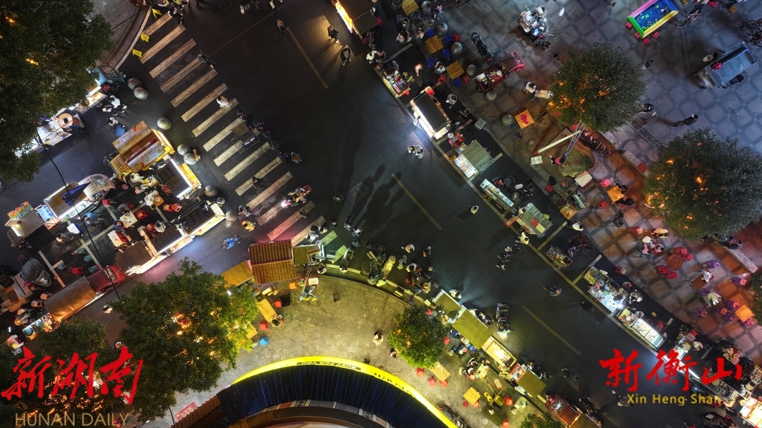 夜幕降临,华灯初上。群英夜市美食街人头攒动,霓虹璀璨,醒目的灯箱与绕树灯饰在升腾的烟火气中,装点着衡山热闹又鲜活的夜晚。