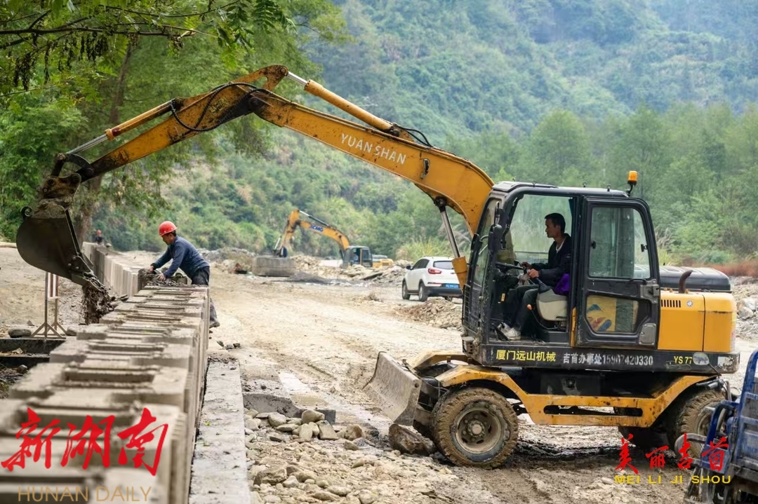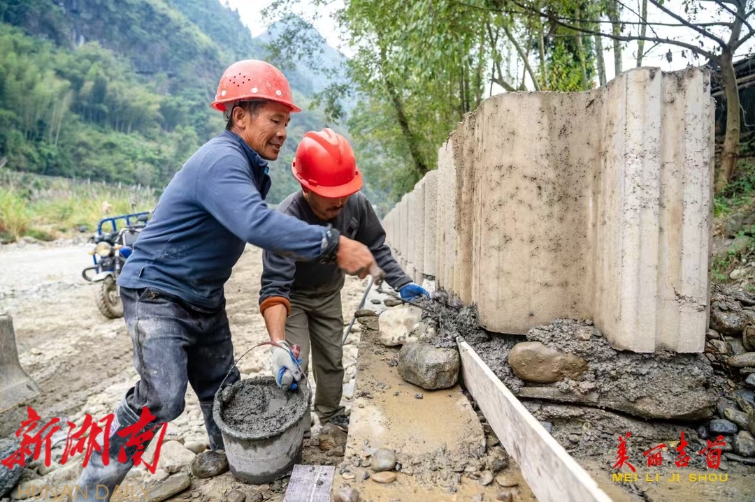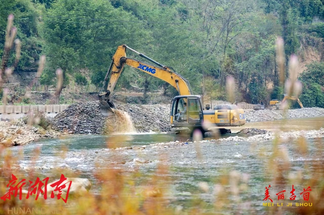 11月9日,吉首市矮寨镇坪朗村峒河治理工程建设现场,施工人员在修建河堤。