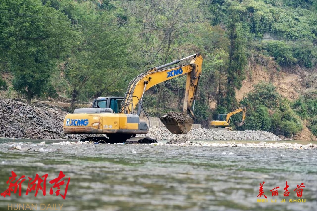 11月9日,吉首市矮寨镇坪朗村峒河治理工程建设现场,施工人员在操作挖掘机疏浚河道。