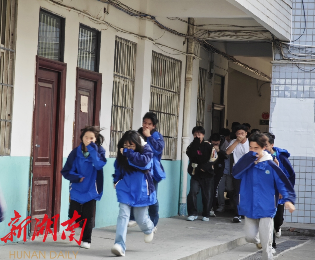 上午9时,随着警报声在校园内骤然响起,演练正式开始。各班教师以及宿管员迅速组织学生捂住口鼻,弯腰低姿沿着预定疏散路线快速、有序地撤离教学楼以及宿舍楼,到达安全地带。整个疏散过程井然有序,达到了预期效果。