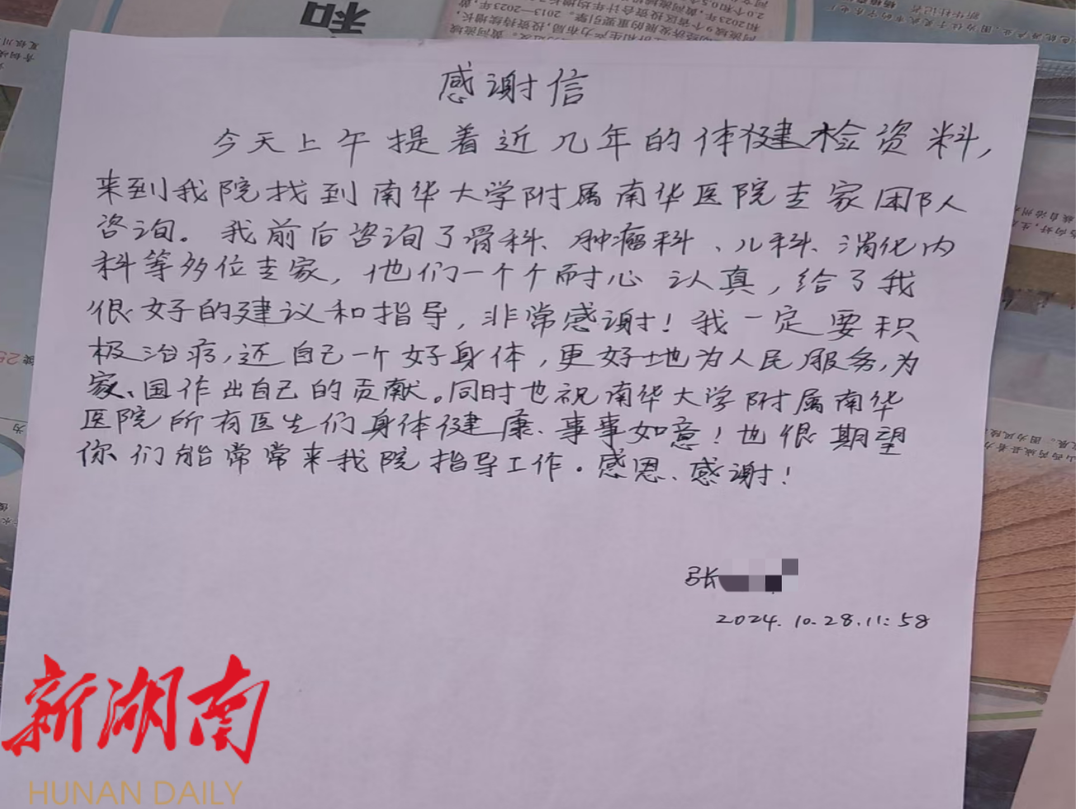 前来就诊的患者也对医疗队赞誉不绝。在巡回医疗过程中,南华医院专家团队凭借专业素养和无私奉献精神,赢得了广泛的社会赞誉和高度评价。例如,在圳上镇中心卫生院,一位患有肝脏肿瘤、腰腿痛及高血压等多种疾病的张大姐,在义诊现场得到了多位专家的细致分析和耐心讲解。专家团队不仅对她的医疗资料进行了深入剖析,还就后续治疗及健康管理提供了详尽的建议。张大姐深受感动,写下了满载深情的感谢信。