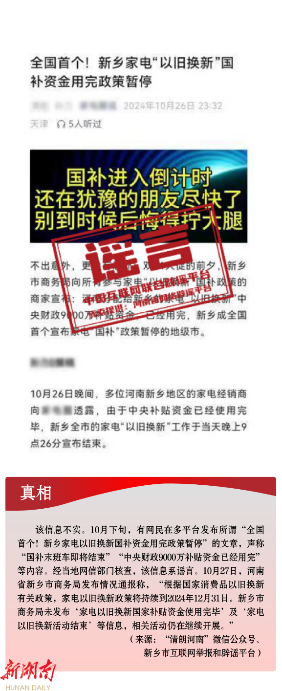 河南新乡家电“以旧换新”国家补贴资金用完、政策暂停?