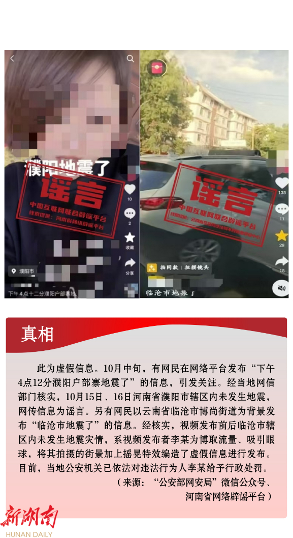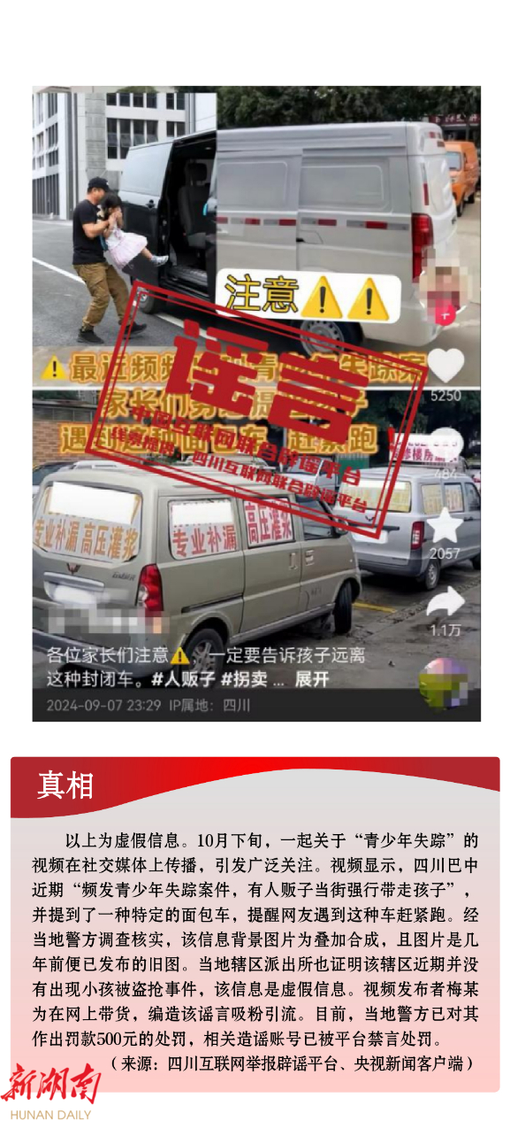 重拳出击打击谣言。 面对各类网络谣言,各级网信和公安部门坚持重拳出击,加大打击力度。10月以来,山西网民高某某利用AI技术生成虚假图像虚构剧情“网上寻娃”,重庆网民陈某某编造“喝酒开车警察不管”谣言,四川网民梅某编造“四川巴中频繁有青少年失踪”谣言,杭州网民段某某编造“杭州东站电车自燃烧死人”谣言等,均被当地警方依法予以罚款、行政拘留等处罚,网信部门亦对相关造谣账号予以禁言处罚或依法依约关闭。10月12日,中央网信办通报,网信部门指导网站平台持续加大监测和处置力度,及时溯源并关闭谣言首发账号,累计处置相关违法违规账号8583个,同时公开曝光第五批部分网络谣言典型案例,有力发挥了警示震慑作用。