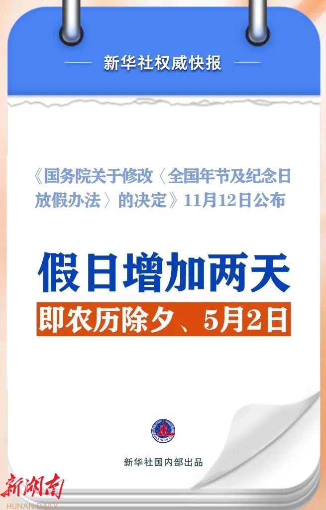 《国务院关于修改<全国年节及纪念日放假办法>的决定》11月12日公布,自2025年1月1日起施行。 决定规定,全体公民放假的假日增加2天 ,即农历除夕、5月2日。全体公民放假的假日,可合理安排统一放假调休,结合落实带薪年休假等制度,实际形成较长假期。除个别特殊情形外,法定节假日假期前后连续工作一般不超过6天。