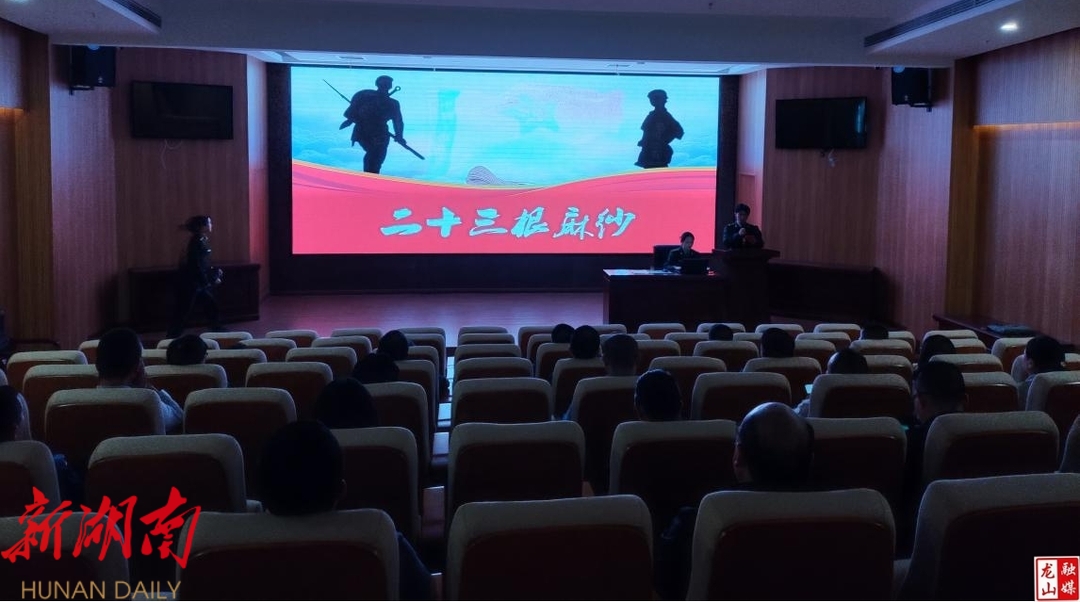 在湘鄂川黔革命根据地纪念馆陈列展报告厅内,全体党员观看《我随贺龙当红军》《再叫我一声娘》和《二十三根麻纱》红色经典故事会。龚桂范、梁俏妹、方汉英三位英雄榜样在龙山这片红色土地上上展现出的家国大义深深感染了在场的每一位党员。