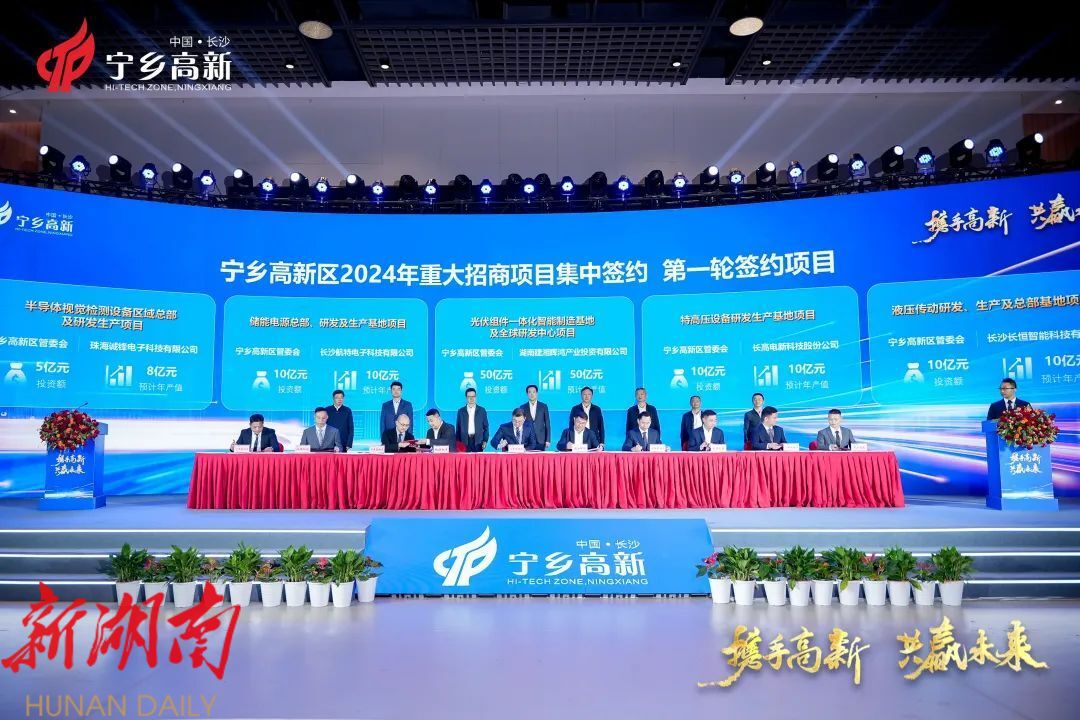此次签约,涵盖储能材料、智能装备、工程机械、半导体、生物医药等多个领域。其中,建湘晖鸿光伏组件一体化智能制造基地及全球研发中心项目拟投资50亿元,总用地约280亩,预计全部满产后年产值可达100亿元以上;长高电新特高压设备研发生产基地项目拟投资10亿元,用地60亩,预计新增年产值约10亿元、年税收约6000万元,建成我国长江以南唯一具备生产制造百万伏交直流特高压电器设备条件的生产制造基地;航特电子储能电源总部、研发及生产基地项目盘活闲置用地51.5亩,拟投资10亿元,预计年产值10亿元;诚锋科技半导体视觉检测设备区域总部及研发生产项目由珠海诚锋电子科技有限公司投资建设,是一家专注于解决半导体FAB前道光学检测卡脖子技术的硬科技公司;追锋汽车车载声学系统及数字功放研发生产制造项目由上海追锋汽车系统有限公司投资建设,在国内率先实现车载声学算法、调音工具链的自主研发和国产替代。