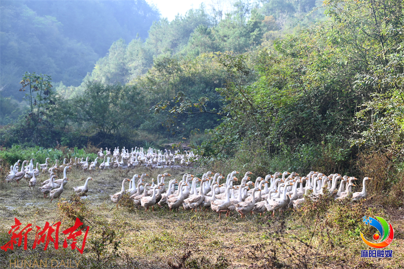 初冬时节,在黄桑乡桃花村梓木冲白鹅养殖基地,一群白鹅齐身越过绿色田野,“嘎嘎嘎”唱响乡野之声,奏响黄桑乡产业发展“协奏曲”,一片和美景色跃然视野。桃花村妇女主任王家银说:“我们白鹅养殖基地采用‘村集体+农户’模式,从今年上半年开始进行试点,分批次养殖,每年可卖白鹅1000多羽。”