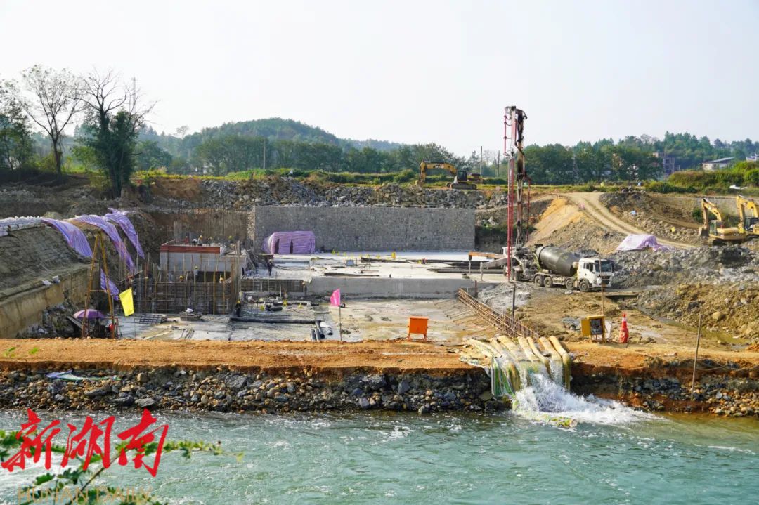 11月11日,在小塘镇姚口渡村红星水闸除险加固工程现场,大型挖掘机、材料运输车、水泥罐车正开足马力加紧施工,一派热火朝天的建设场面。目前,施工单位利用当前天气晴好、河流水位偏低等有利条件,抢时间、抓进度,全力推进项目建设。