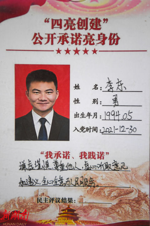 7月5日,岳阳县毛田镇政府办公楼的公开承诺墙,这是李东的身份牌。傅聪 摄