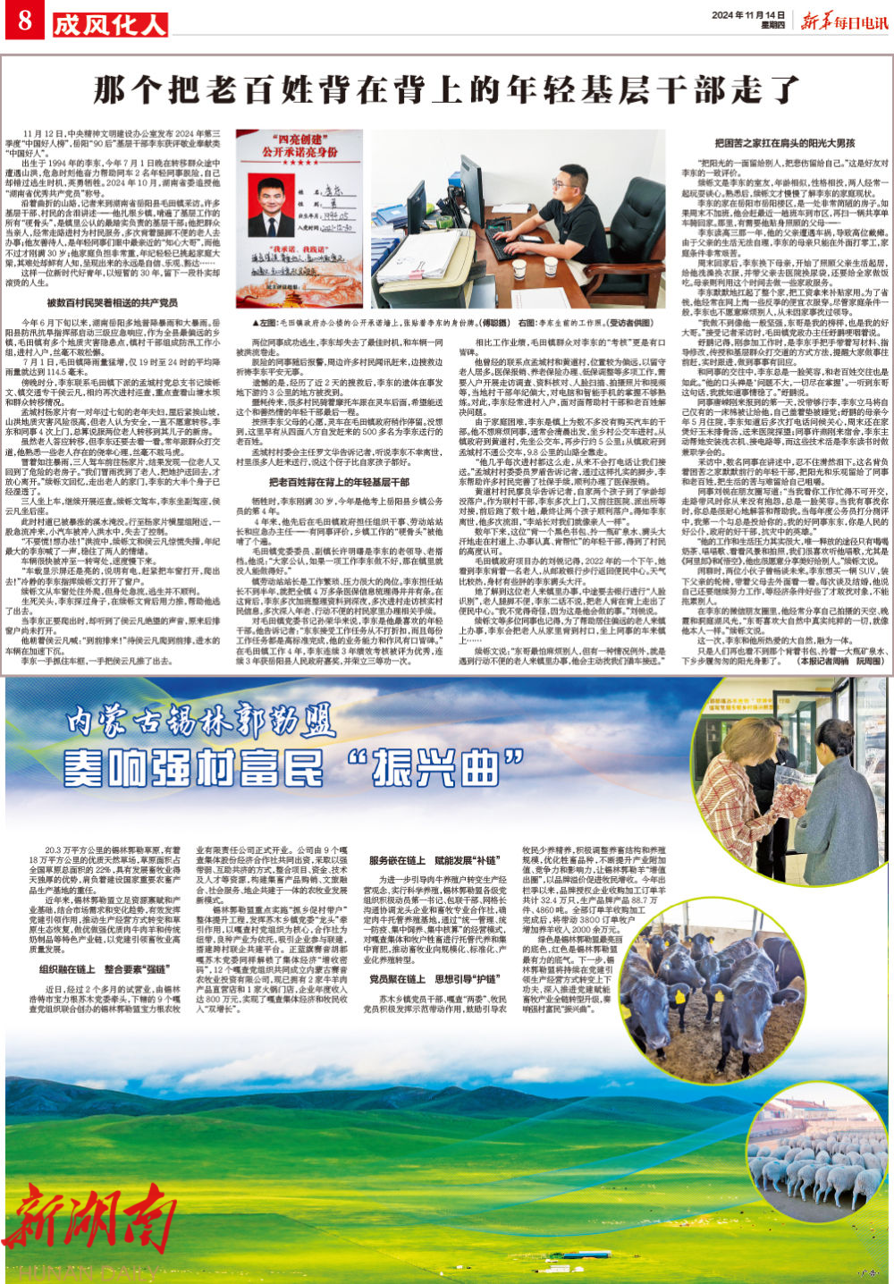沿着曲折的山路,记者来到湖南省岳阳县毛田镇采访。许多基层干部、村民的含泪讲述——他扎根乡镇,啃遍了基层工作的所有“硬骨头”,是镇里公认的最踏实负责的基层干部;他把群众当亲人,经常走路进村为村民服务,多次背着腿脚不便的老人去办事;他友善待人,是年轻同事们眼中最亲近的“知心大哥”,而他不过才刚满30岁;他家庭负担非常重,年纪轻轻已挑起家庭大梁,其难处却鲜有人知,呈现出来的永远是自信、乐观、豁达……