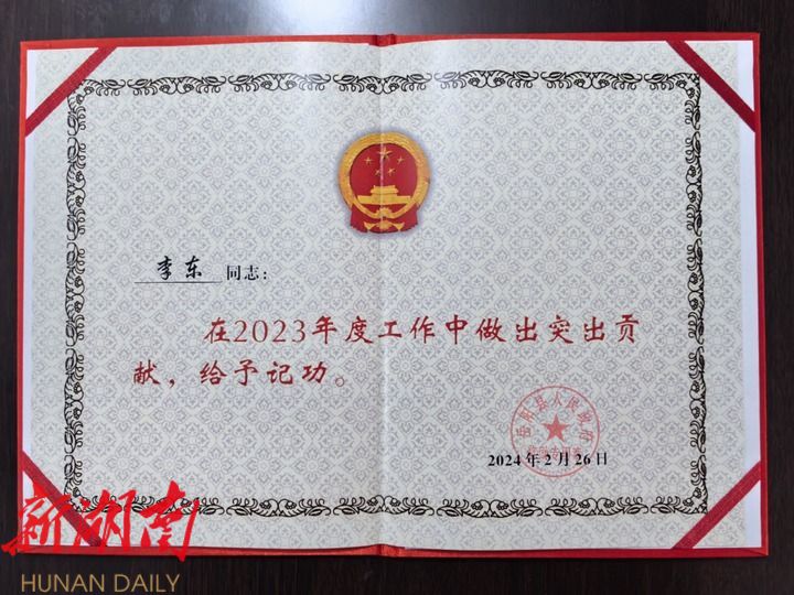 对毛田镇党委书记孙荣华来说,李东是他最喜欢的年轻干部。他告诉记者:“东东接受工作任务从不打折扣,而且每份工作任务都是高标准完成,他的业务能力和作风有口皆碑。”在毛田镇工作4年,李东连续3年绩效考核被评为优秀,连续3年获岳阳县人民政府嘉奖,并荣立三等功一次。
