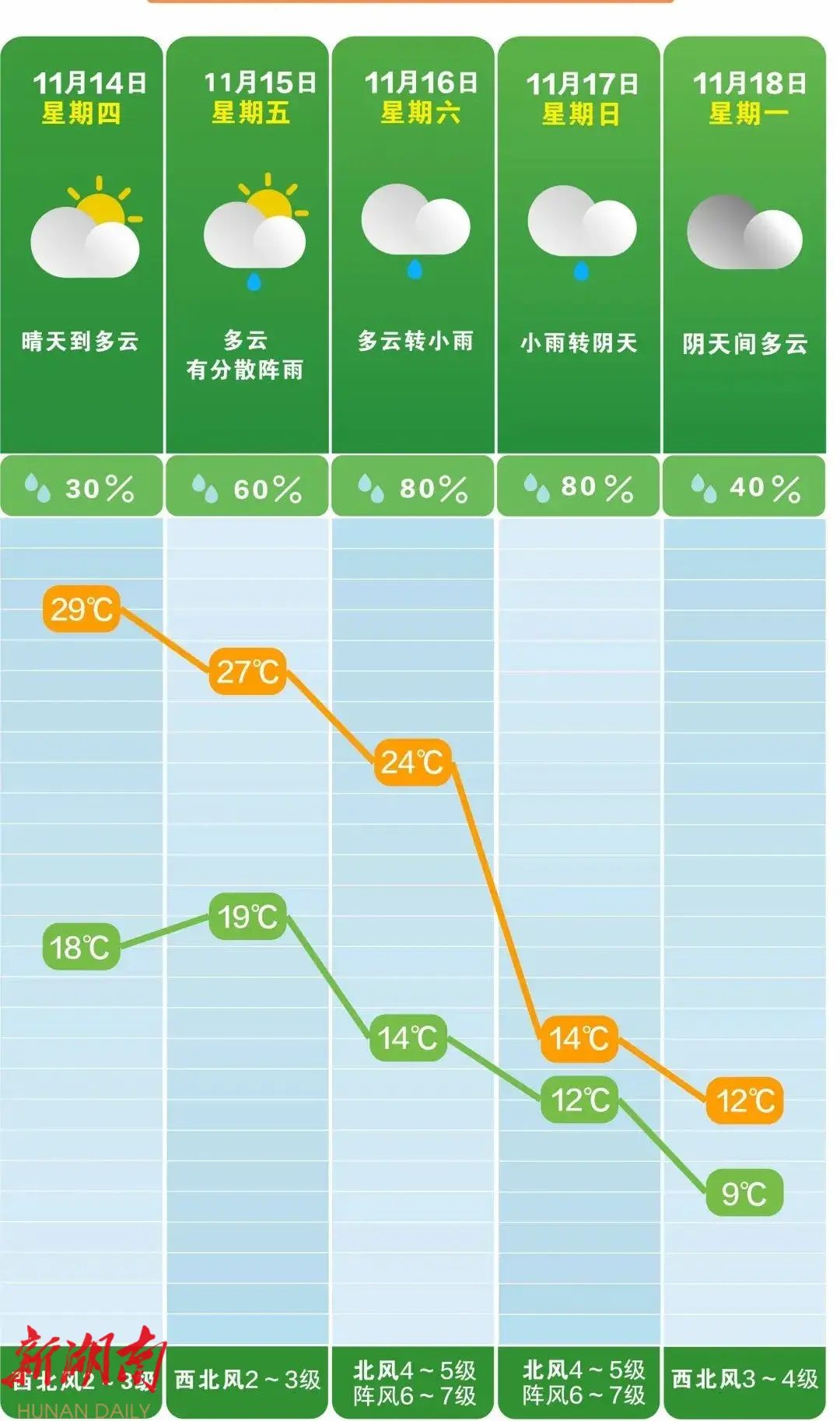 11月15日晚上到16日白天,全省多云间阴天有分散性阵雨;北风2~3级;最高气温湘北24~26℃,其他地区28~30℃;最低气温湘北16~18℃,其他地区18~20℃。