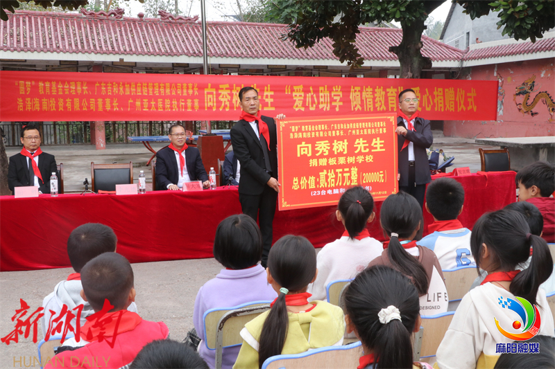 11月12日,麻阳苗族自治县板栗树学校举办“爱心助学·倾情教育”捐赠活动。“圆梦”教育基金会理事长、广东吉和永加供应链管理有限公司董事长、麻阳籍优秀企业家向秀树共家乡板栗树学校捐赠价值20万元的教学物资。
