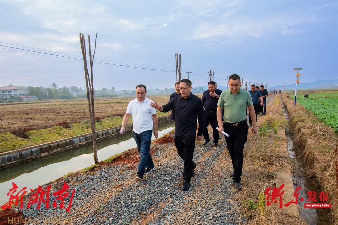 图:蒋崇华在杨桥镇东烟村实地查看衡东县高标准农田建设项目实施情况