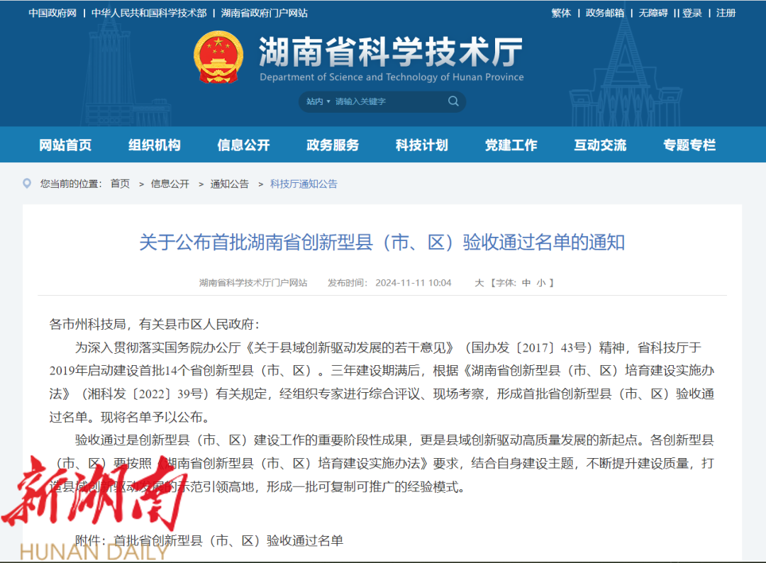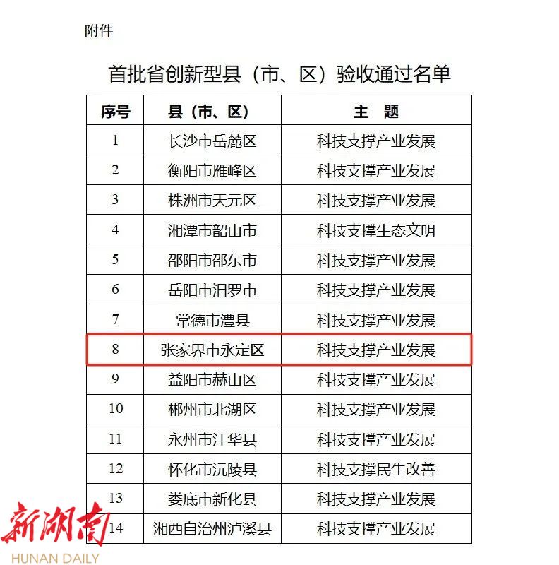 湖南日报·新湖南客户端11月15日讯(记者 解雯惠) 近日,省科技厅发布了首批湖南省创新型县(市、区)验收通过名单的通知,全省14个首批启动建设的创新型县(市、区)经省科技厅组织专家进行综合评议、现场考察,此次成功通过验收,永定区名列其中。