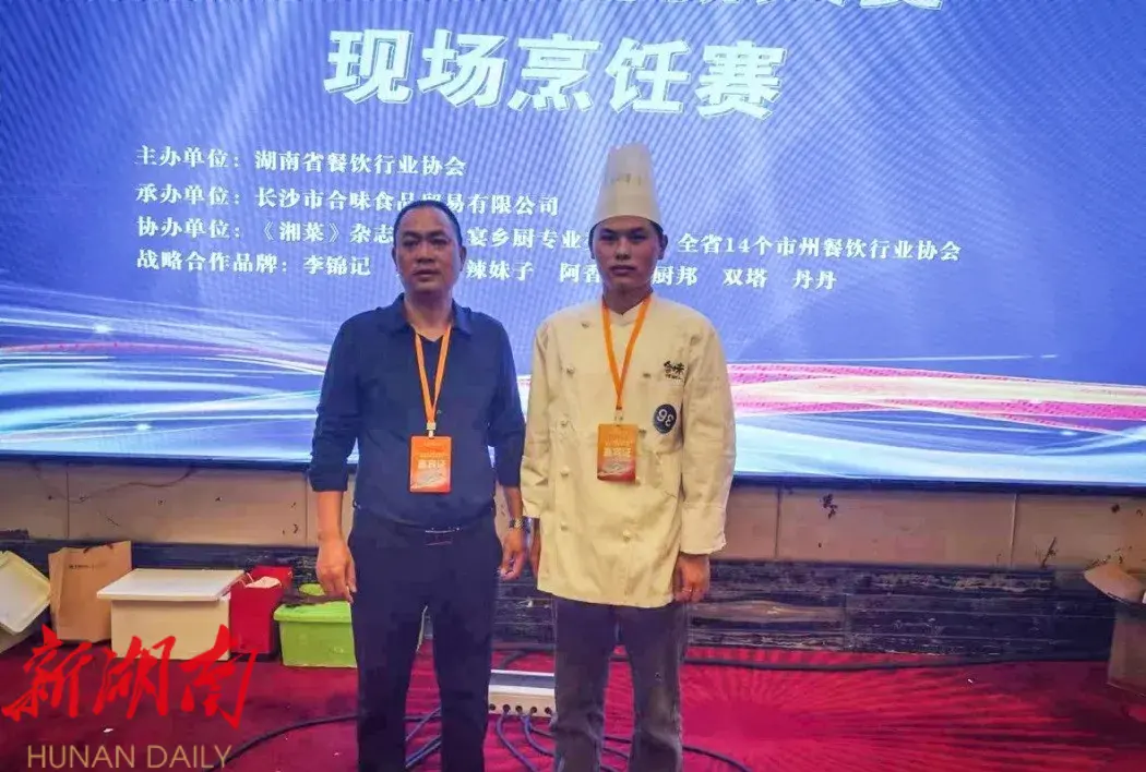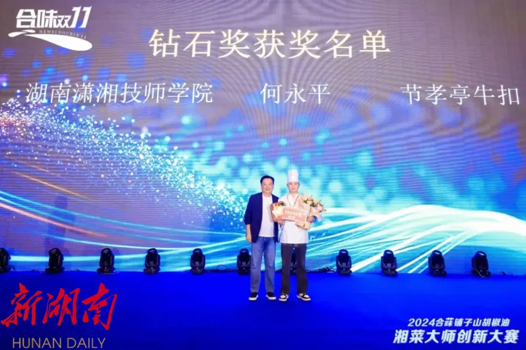 湖南日报·新湖南客户端11月20日讯(通讯员 唐浪)近日,由湖南省餐饮行业协会主办的2024年湘菜大师创新大赛在长沙举行。赛事汇聚全省14个市州选拔的36名湘菜顶尖高手参赛,比赛奖项设钻石奖1名、铂金奖3名、金奖6名。经过两个半小时的激烈角逐,最终,来自永州市餐饮行业协会推荐的由湖南潇湘技师学院教师胡先雨指导的学生何永平凭借作品“节孝亭牛扣”夺得钻石奖的桂冠。