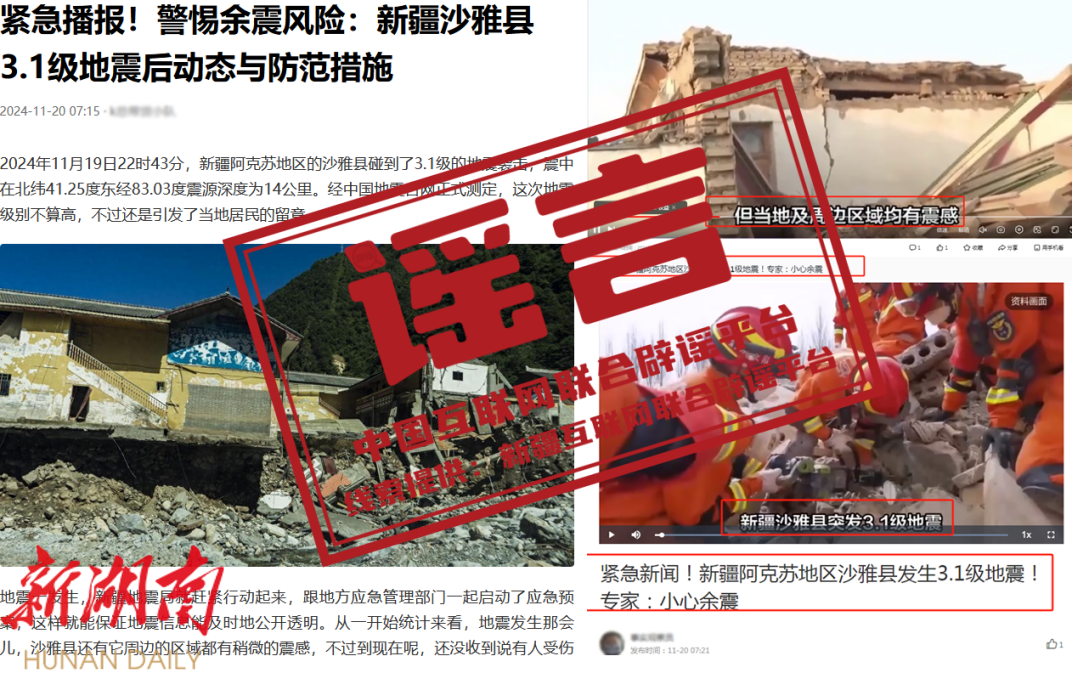 详情: 11月19日,新疆阿克苏地区沙雅县发生3.1级地震,震中位于农田区域,距离沙雅县城21.2公里。经初步排查,沙雅县城区无震感,城区通讯、供电、交通道路状况正常,暂未接到人员伤亡和财产损失情况报告。但有部分自媒体账号在网络上发布一些地震废墟或灾后救援等图片和信息。对此,当地网信部门发布辟谣声明称,网传废墟和救援图片并非真实的地震现场,系某些自媒体账号罔顾事实和真相,为博取流量、吸引眼球编造发布,混淆视听误导网民。网信、公安部门郑重提醒,对编造散布地震谣言扰乱公共秩序、造成恶劣社会影响的行为,公安机关将依法依规严肃查处。(来源:“新疆网络辟谣”微信公众号、阿克苏网络举报)