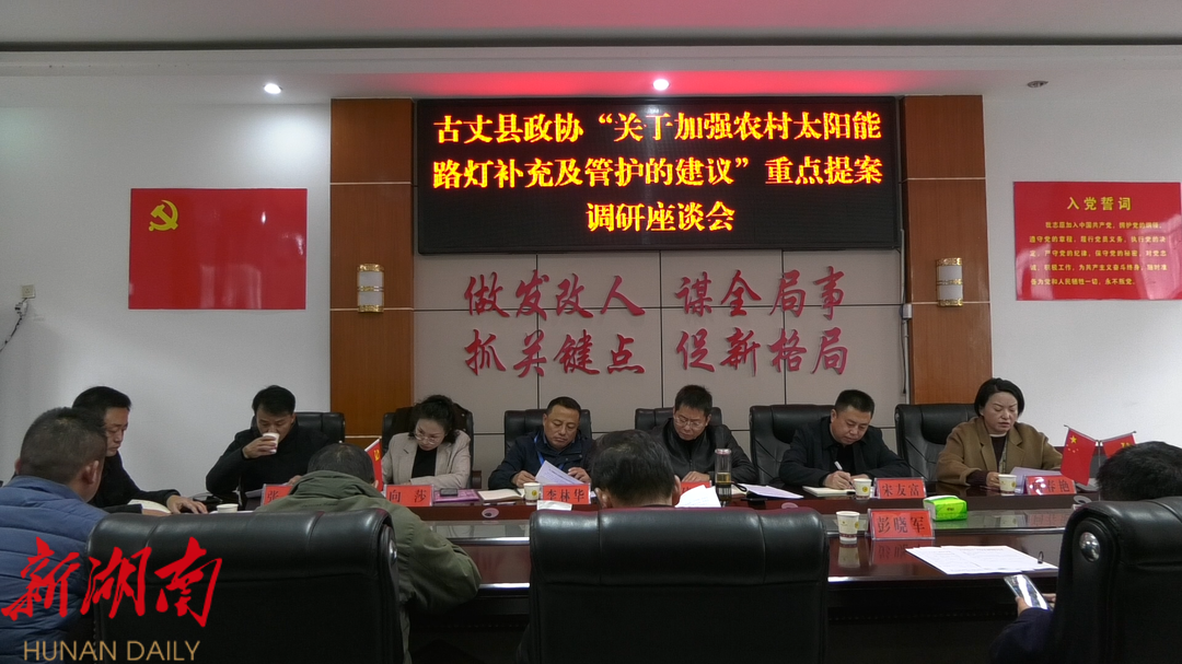 座谈 会上, 县发改局汇报了重点提案的办理情况,县农业农村水利局、县城乡建设和交通运输局汇报农村太阳能路灯补充及管护情况,提案人就提案的办理情况表示满意并提出下一步工作建议,参会单位和参会领导围绕农村太阳能路灯的补充和管护工作进行发言。陈建新在总结时强调,要提高站位、高度重视;要厘清责任,各方担责;要统一规划、分步实施;要建章立制、长效管护;要充分沟通、 尊重民意 。
