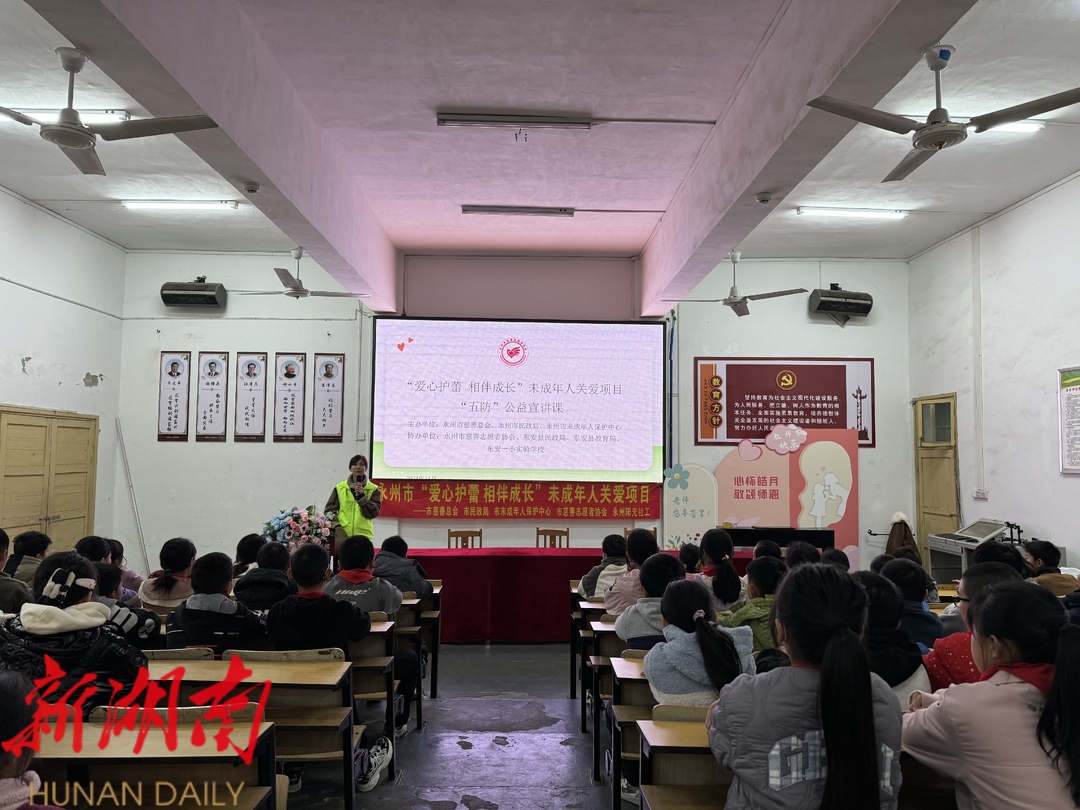 新湖南客户端11月25日讯(通讯员 唐悦)11月25日,“爱心护蕾 相伴成长”未成年人关爱项目“五防”公益宣讲课活动在东安县一小实验学校开展。活动由永州市慈善总会、永州市民政局、永州市未成年人保护中心主办,面向未成年人开展的防性侵、防溺水、防诈骗、防校园欺凌、防灾害 “五防”安全教育讲座。