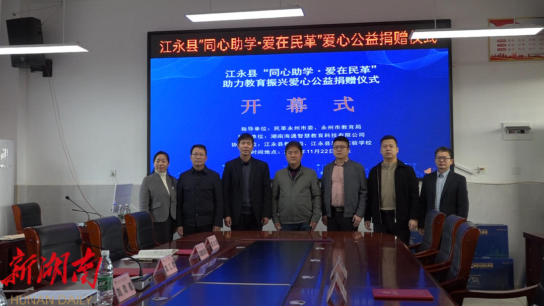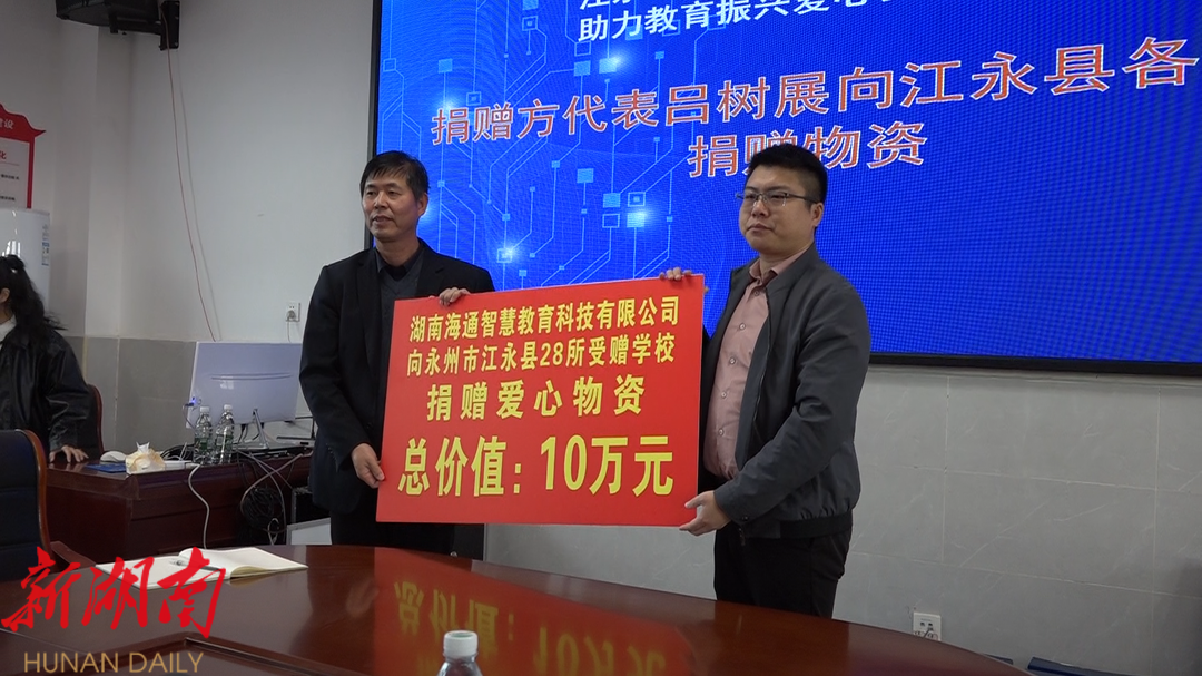 本次公益活动由民革永州市委、永州市教育局指导,由湖南海通智慧教育科技有限公司实施捐赠。仪式上,湖南海通智慧教育科技有限公司向江永县中小学校捐赠总价值达10万元的“无人机科技设备”“音乐教室”“教师乳胶枕”及系列名师课堂资源。