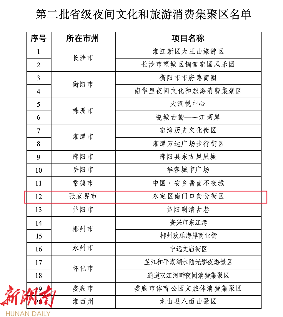 11月22日晚,“潮起潇湘 相约湖南”2024湖南文化和旅游消费季启动仪式在衡阳市举行,现场公布了第二批省级夜间文化和旅游消费集聚区名单并进行授牌。其中, 张家界市永定区南门口美食街区 榜上有名。