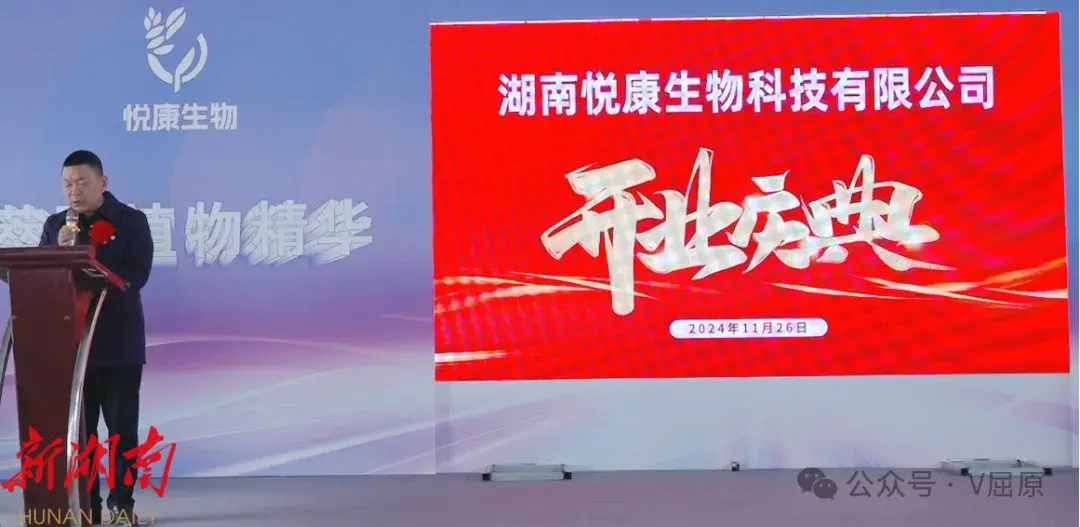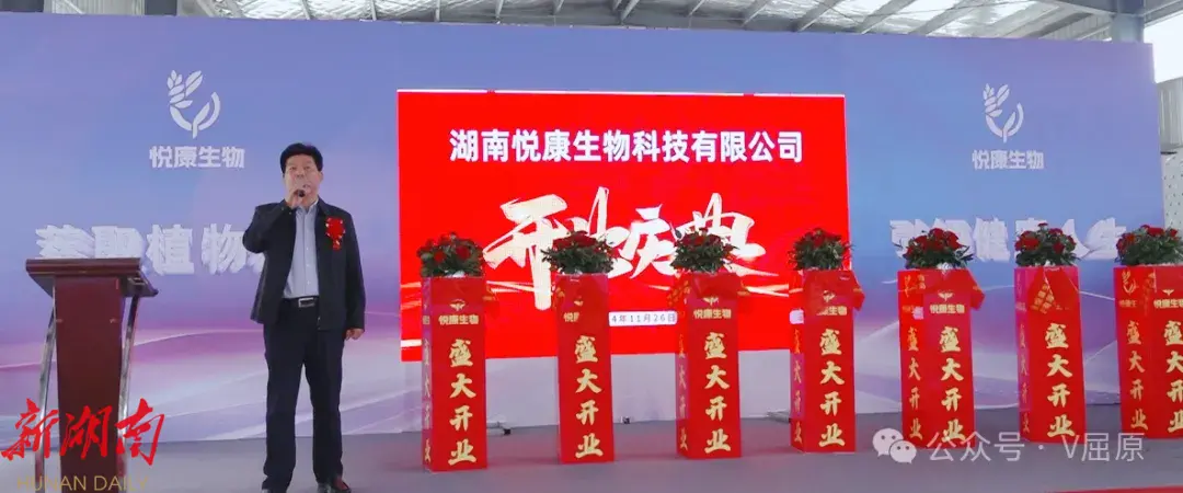 湖南日报·新湖南客户端11月27日讯(通讯员 姜瑶)11月26日,湖南悦康生物科技有限公司正式开业。汨罗市人民政府原 市长、湖南省民政厅原 副厅长余贤规,屈原管理区管委会副主任陈学礼,区人大政协工委副主任刘建云,湖南省植物提取物协会理事长张宝堂,区直相关部门负责人,湖南悦康生物科技有限公司、长沙市岳阳商会、湖南华诚生物资源股份有限公司、晨光生物科技集团股份有限公司及植物提取同行公司负责人等出席活动。