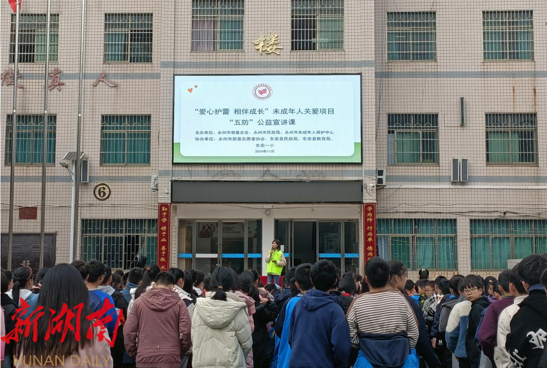 新湖南客户端11月27日讯(通讯员 周新君 龚伟龙)11月26日,“爱心护蕾 相伴成长”未成年人关爱项目“五防”公益宣讲课活动走进东安县白牙市镇第一小学。
