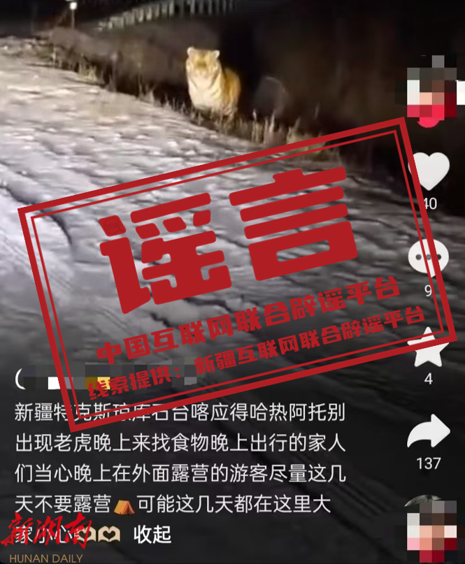 真相: 近期,有网民发布视频称:“新疆特克斯县琼库什台村出现老虎,晚上出行的家人们当心,在外露营的家人们这几天不要露营。”经特克斯县林业和草原局核实,琼库什台牧业村附近未发现过老虎踪迹,该地自然环境也不适合老虎生存,该信息属于谣言。(来源:“新疆网络辟谣”微信公众号)
