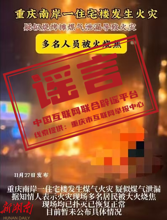 真相: 11月27日,有自媒体发布视频称“重庆南岸一住宅楼发生火灾,火灾现场多名居民被大火烧焦”“南坪大火现已失去生命19人”,引发关注。经当地消防救援部门初步核实,网传信息系谣言。当日,重庆市南岸区消防救援局发布警情通报称,2024年11月26日23时39分,南岸区江南大道66号一住宅发生火灾,现场1人受伤,已送医院全力救治。火灾原因为1楼面馆经营人员操作不当,导致灶台起火引燃周边可燃物所致,火势沿外墙向上蔓延。(来源:“重庆辟谣”微信公众号)