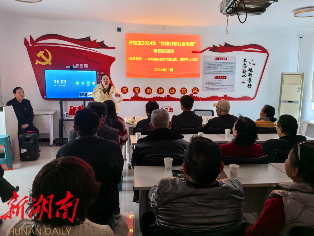 湖南日报·新湖南客户端11月28日讯(通讯员 陈哲锋)11月27日,开福区东风路街道国防科大社区与东风路社区联合举办开福区2024年“党建引领 社会治理”专题培训班,邀请开福区“五老讲师团”金牌讲师郝建军以“强我国防,爱我中华”为题进行专题授课。区、街道联点领导、社区“两委成员”、社区党员居民代表、网格管理员、志愿者骨干、小区楼栋长等100余人参加培训。