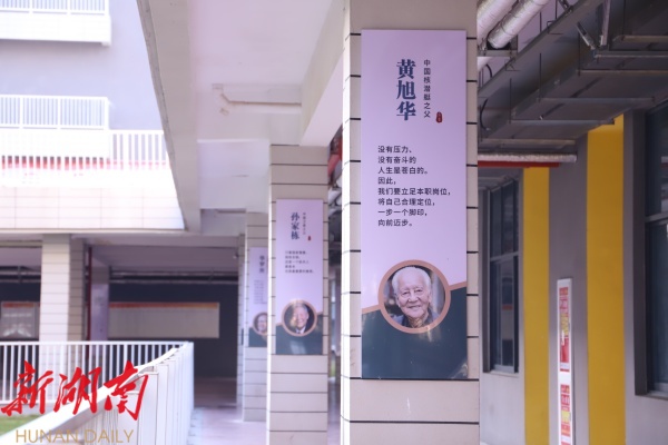 在一楼走廊,张贴了大量杰出科学家事迹和座右铭,以及国学经典的宣传内容,使文明礼仪、家国情怀厚植于学生心中。