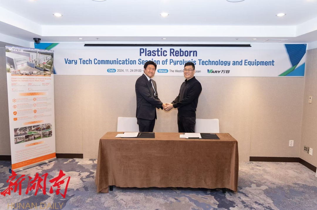 湖南日报·新湖南客户端11月29日讯(长沙经开区工作站记者 陈琪 通讯员 刘艺)11月25日至12月1日,塑料污染政府间谈判委员会第五次会议(INC-5)在韩国釜山举行。期间,湖南万容科技股份有限公司与韩国知名环保企业签约,就废塑料化学回收技术进行合作,携手应对全球塑料污染问题。