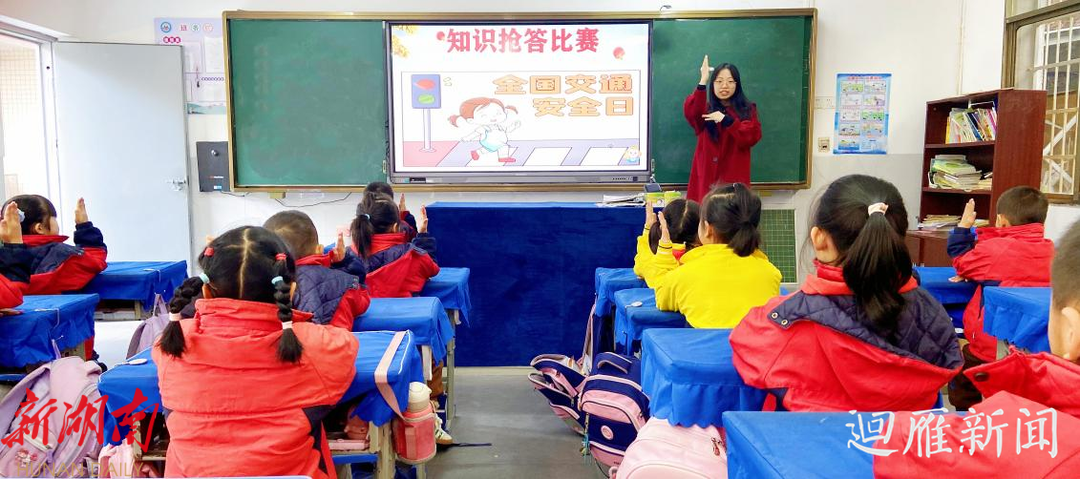 “行人在通过无交通信号灯控制的人行横道时,哪些做法是危险的?”“驾驶电动自行车应该年满多少岁......”11月29日下午,雁峰区飞雁学校各班级举行交通安全知识抢答赛,孩子们面对一个个“熟悉”而又不确定的情景问题,争先恐后地举手抢答,气氛十分活跃。