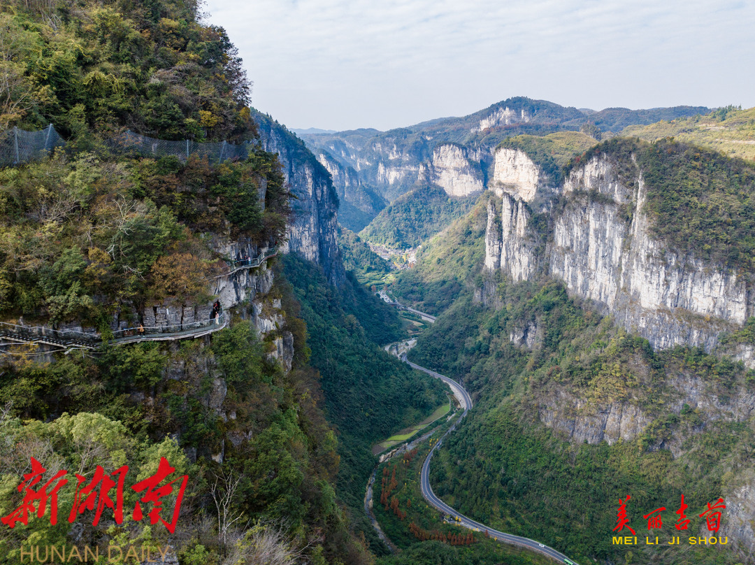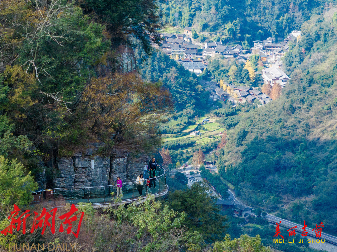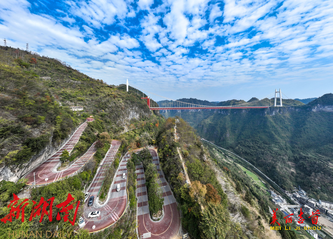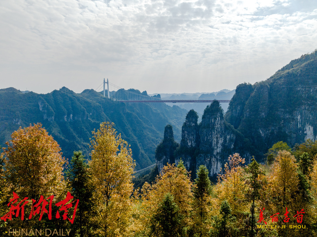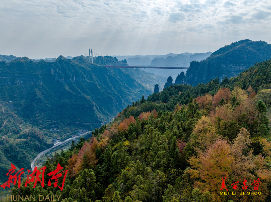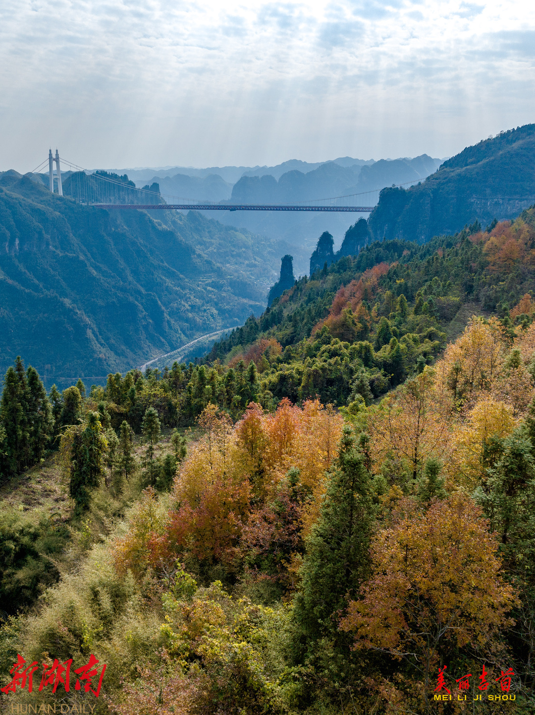 2024年12月1日,湖南省土家族苗族自治州吉首市矮寨大桥附近层林尽染,色彩斑斓的枫树、乌桕等树木点缀在山峦起伏间,与大桥、峡谷交相辉映,绘就出一幅多彩冬日生态画卷,吸引不少游客前来休闲观光。