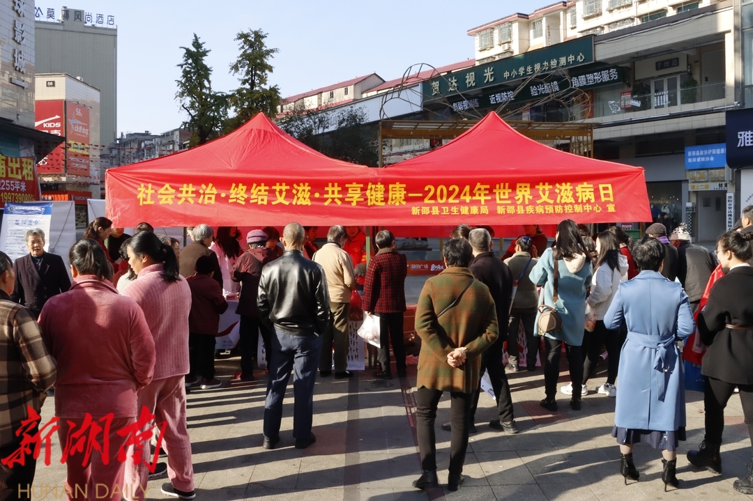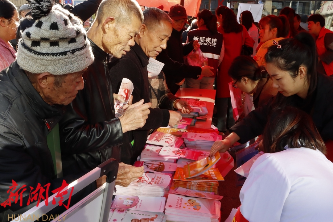 新新邵客户端11月29日讯 今年12月1日是第37个 “世界艾滋病日” 。 为 进一步推动艾滋病性病防治工作,营造全社会参与艾滋病性病防治工作的良好氛围, 11月29日, 县艾滋病防治委员会办公室组织 县卫健局、县疾控中心、县公安局、县人民医院、妇幼保健和计划生育服务中心、县妇联等 县直防艾成员单位和县级医疗机构在 新邵湾田 广场开展以“社会共治 , 终结艾滋 , 共享健康” 为 主题 的 宣传服务活动。