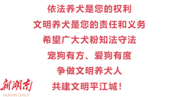 为进一步规范养犬行为, 提升市民文明养犬意识,今年9月, 我市发布 《岳阳市养犬管理条例》 (点击查看《条例》详情) , 与此同时,县创文办、县公安局联合发起 倡议 (点击查看《@平江人,请牵好手中“文明绳”》详情) ,并 常态化开展 养犬整治行动。
