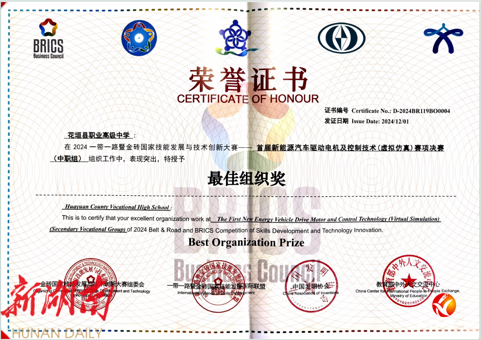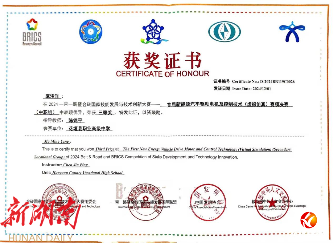 11月30日,2024“一带一路”暨金砖国家技能发展与技术创新大赛首届新能源汽车驱动电机及控制技术(虚拟仿真)决赛在湘西民族职业技术学院顺利闭幕,花垣县职业高级中学载誉而归。此次比赛分为中职组和高职组两组,经过激烈的比拼和角逐,花垣县职业高级中学学生龙健获中职组一等奖(指导教师杨智)、麻洺洋获中职组三等奖(指导教师陈锦平)、梁明志获中职组优秀奖(指导教师冯伟华),学校荣获最佳组织奖。