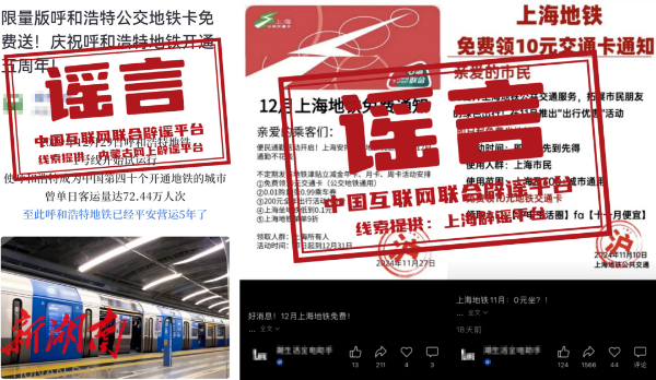 真相: 近日,有自媒体在网上发布所谓“12月上海地铁免费通知”,宣称可“免费领10元交通卡”。另有自媒体打着“庆祝呼和浩特地铁开通5周年”的旗号,宣称“限量版呼和浩特地铁卡免费送”。对此,上海、呼和浩特两地轨道交通部门均回应称,“并未发售也未与任何公司、个人合作发售此类卡片”“相关自媒体发布虚假信息的行为属于编造、传播企业虚假信息和误导信息,明显系诈骗信息或某些不法分子的营销手段”。