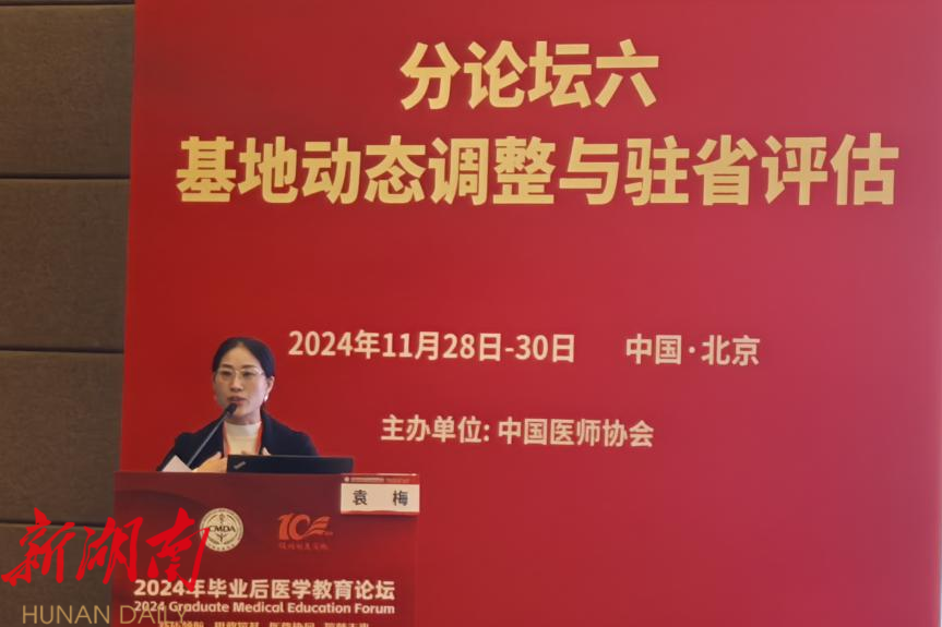 为深入贯彻党的二十届三中全会精神,加速我国毕业后医学教育政策的落地实施,进一步推动医学人才培养的改革创新与质量提升,中国医师协会成功举办了第十届“毕业后医学教育论坛”(原名住院医师规范化培训高峰论坛)。论坛上,袁梅进行了题为《借助驻省评估,聚焦住培难点热点,推进住培质量全面提升》的主题演讲。她分享了南华医院如何以国家驻省评估为契机,通过创新住培管理模式、强化师资团队建设、落实师生绩效激励机制、加强沟通交流与人文关怀、完善临床实践保障体系等措施,实现了住培质量的全面提升。袁梅的演讲获得了与会专家的高度赞誉与广泛认可,现场反响热烈。