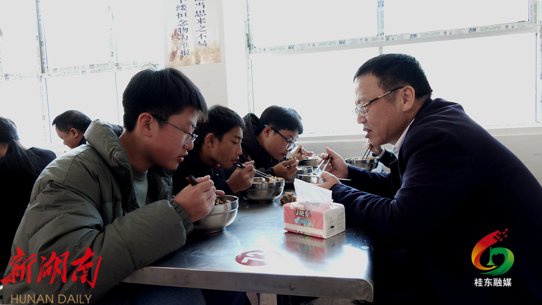 时至中午,伍志平与沤江镇增口九年制学校师生一起在学校食堂就餐,与同学们亲切交谈,关切询问他们饭菜是否符合口味、价格是否满意,叮嘱大家要珍惜粮食、注意营养均衡,鼓励他们努力学习,实现自身人生价值。