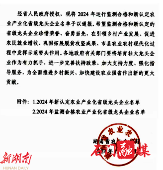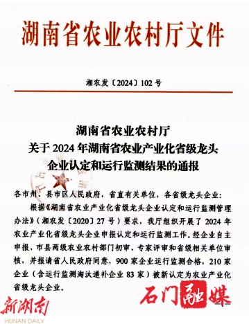 湖南日报·新湖南客户端12月4日讯(通讯员 王芳 李桃石)12月2日,从长沙传来喜讯,湖南省农业农村厅公布的《关于2024年湖南省农业产业化省级龙头企业认定和运行监测结果的通报》显示,石门县有湖南湘佳橘友农业有限公司、湖南石门渫峰名茶有限公司、湖南怡田美农业科技有限公司、正大畜牧(石门)有限公司 等4家企业被认定为“湖南省农业产业化省级龙头企业”;原有4家“湖南省农业产业化省级龙头企业”监测合格。至此,石门县拥有的“湖南省农业产业化省级龙头企业”增至8家。