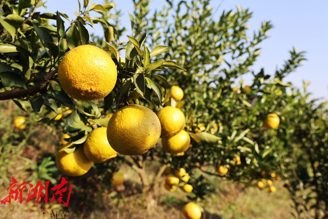新新邵客户端12月3日讯 金果漫青山,柚香飘千里。当下,正是黄金贡柚陆续成熟的季节。在新邵县小塘镇庄山村,200亩黄金贡柚迎来采摘季,漫山遍野的果树上挂满了沉甸甸的果实,远远望去,宛若黄金点点,与蓝天青山相得益彰,美不胜收。