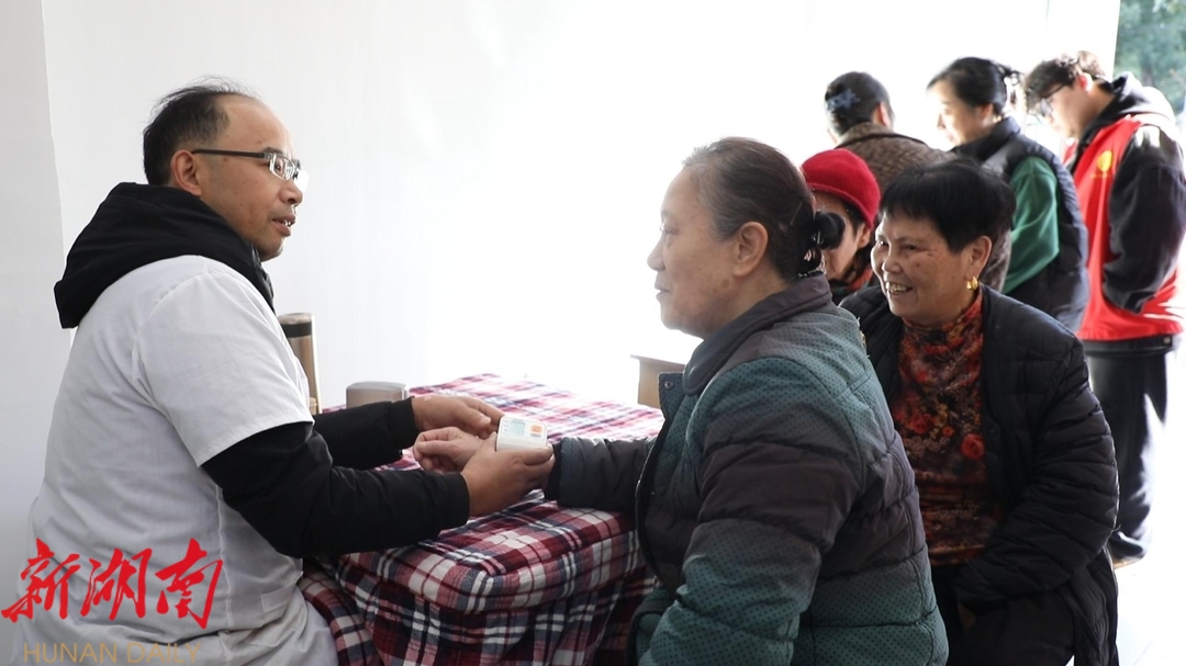 禾青镇资氮社区居民刘松华说:“我量了血压,结果很正常,还有就是我的脚 有点动一下起不来,他就给我解释了一下,要我买个骨刺片,还有要我做艾灸。”