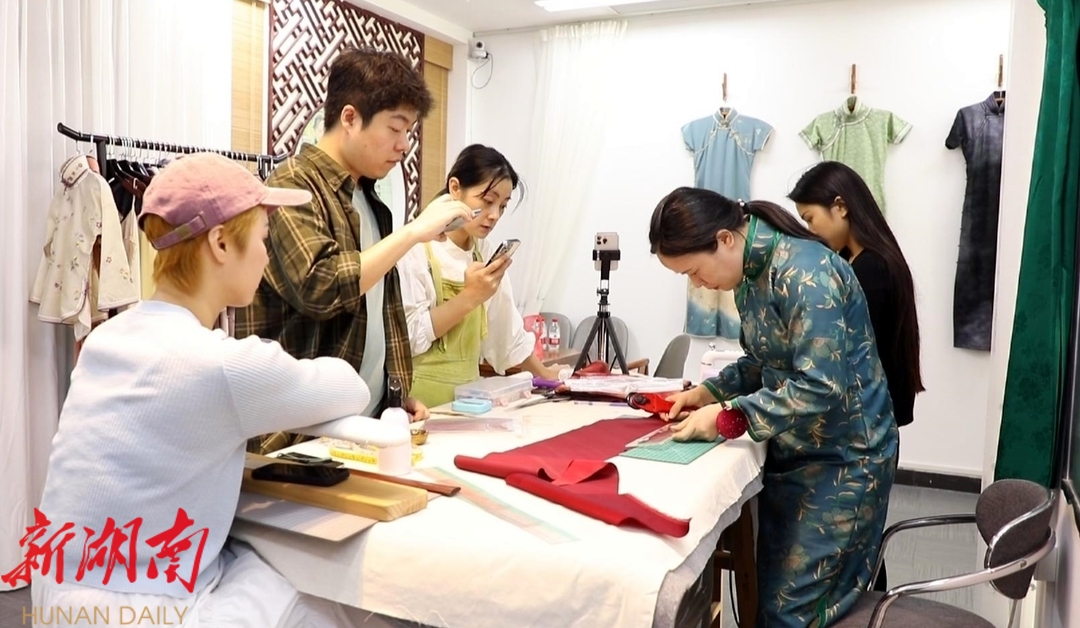 走进肖丽霞位于长沙市岳麓区汀湘十里小区的工作室,宁静悠远的气息扑面而来,肖丽霞正耐心指导培训班学员制作旗袍的绲边与盘扣,学员们则全神贯注地实操练习。在肖丽霞的悉心传授下,学员们不仅学会了手工缝制的基本技巧,更深刻体会到了“工匠精神”的内涵。